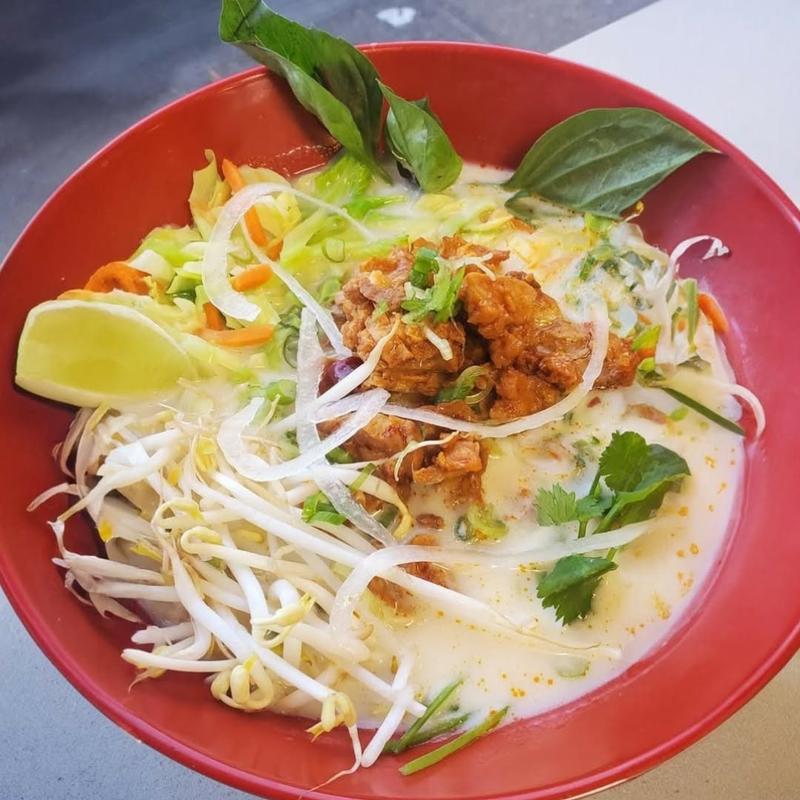 Choice of Noodles: Rice noodles (Gf) ,Wheat Noodles or Udon noodles. Spicy Coconut Broth, Onions, Fried Shallots, Mixed Veggies, Puff tofu ,Bean Sprouts, Mustard Greens. Choice of plant-based protein "Chicken", Tofu(GF). Gf option available